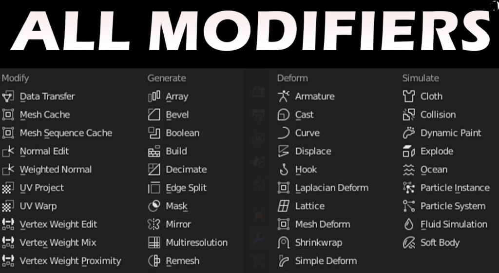 Modifiers umožňují přidat na objekt efekty bez toho, aby se model „rozbil“. Nejčastější: